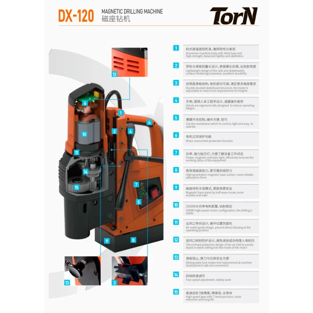 Магнитный сверлильный станок Torn DX-120 — мощность и точность для профессионалов. Магнитный сверлильный станок Torn DX-120 — это надежное решение для сверления отверстий в металлоконструкциях, трубах, листах и других сложных поверхностях. Благодаря встроенному электромагниту станок прочно фиксируется на металлической основе, обеспечивая максимальную точность и безопасность работы даже в вертикальном или потолочном положении.